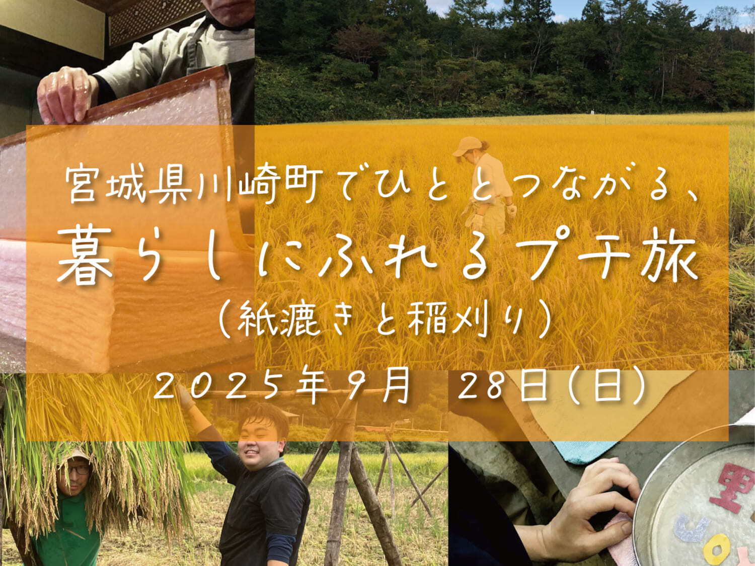 今回のプチ旅のキーワードは、紙漉きと稲刈りです!体験を提供する方々は、皆町外出身であり、川崎町の魅力に惚れ込んで、それぞれが仕事・活動をしている方々です。紙漉きと稲刈りの体験を通して、移住者のくらしを一緒に体験してみてはいかがでしょうか?田舎暮らしの魅力や移住にまつわる体験談も聞けるかもしれませんよ?