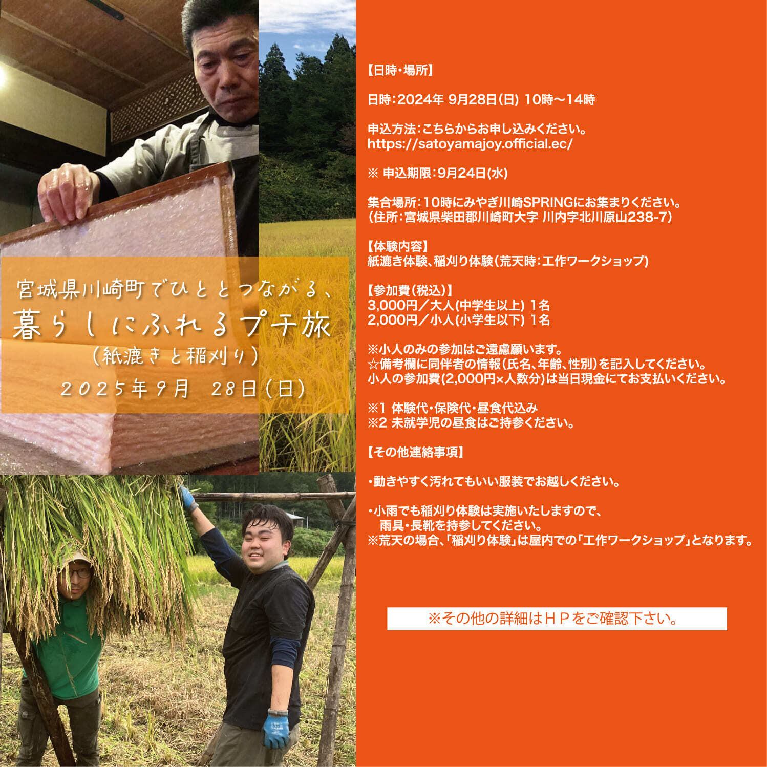 紙漉き体験、稲刈り体験(荒天時:工作ワークショップ)